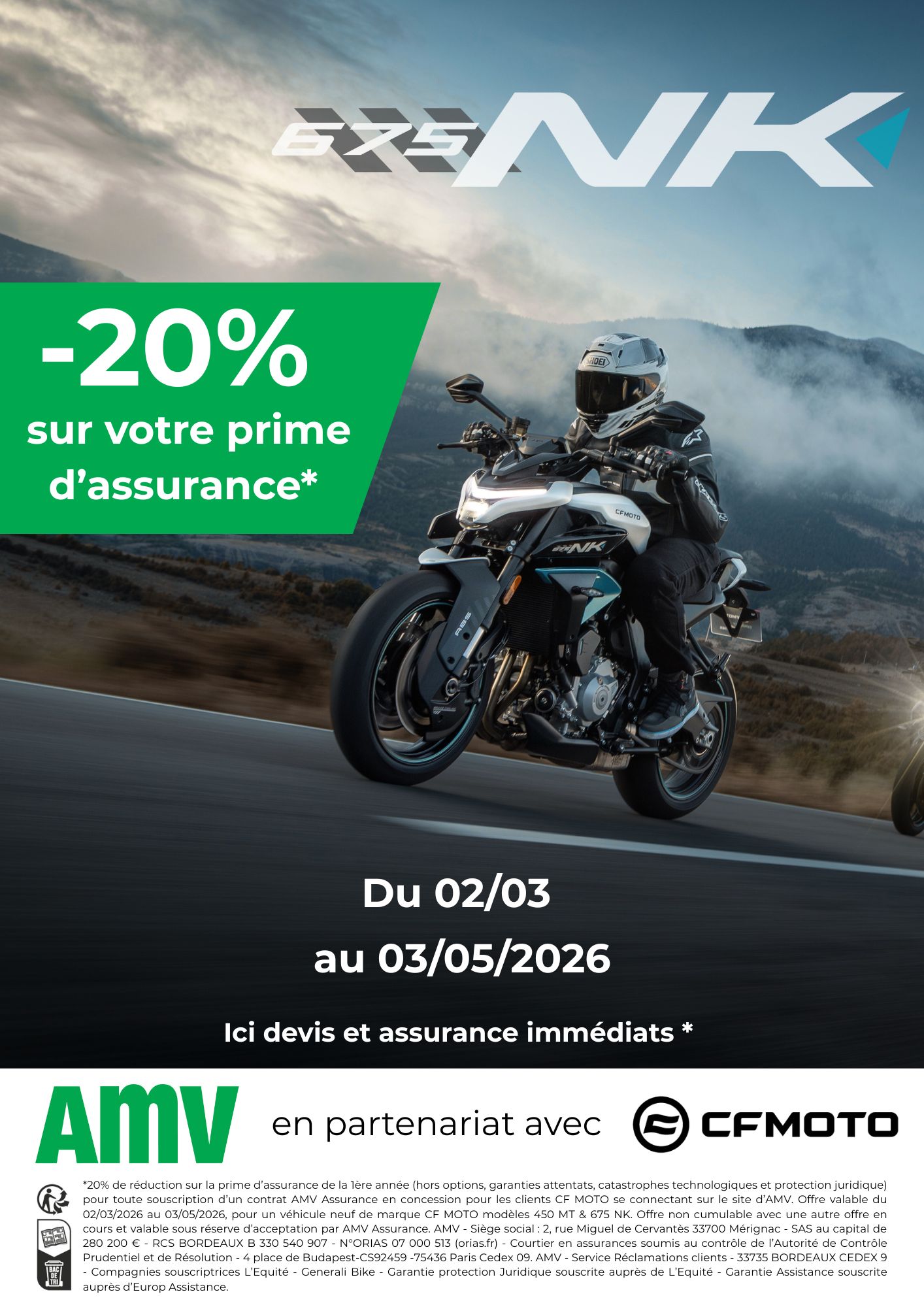 Offre valable du 02/03/2026 au 03/05/2026 inclus, pour un véhicule neuf de marque CFMOTO, modèles : 675 NK. Offre non cumulable avec une autre offre en cours et valable sous réserve d'acceptation par AMV Assurance.